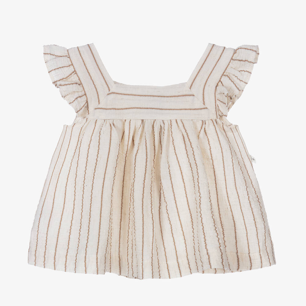 Cute ivory and brown striped dress for little girls from 1 + in the family. Made in a lightweight cotton and viscose blend, the seersucker material is soft against delicate skin. There are feminine ruffles on the shoulders and wooden button fastenings on the back.
