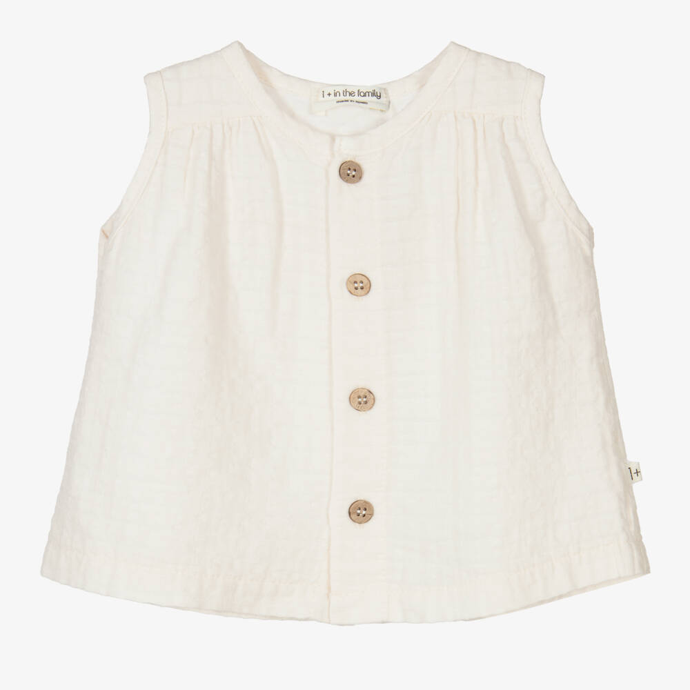 Adorable ivory sleeveless blouse for little girls from 1 + in the family. Made in lightweight cotton seersucker, it is breathable and soft against delicate skin. It fastens with wooden buttons on the front for a sweet finish.