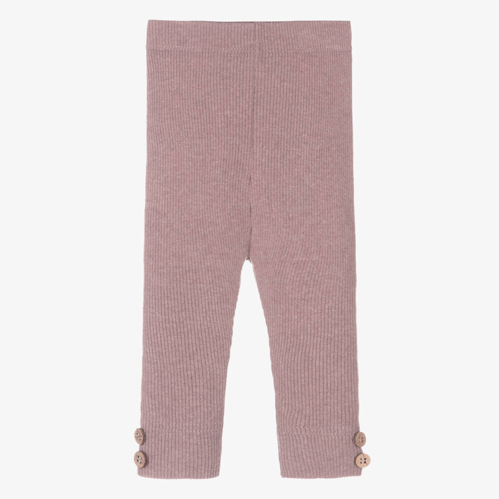 Cute mauve purple long leggings for little girls by 1 + in the family, made in a ribbed, brushed cotton jersey blend. Soft and comfortable to wear, these sweet leggings have wooden button trims on the legs and an elasticated waistband.