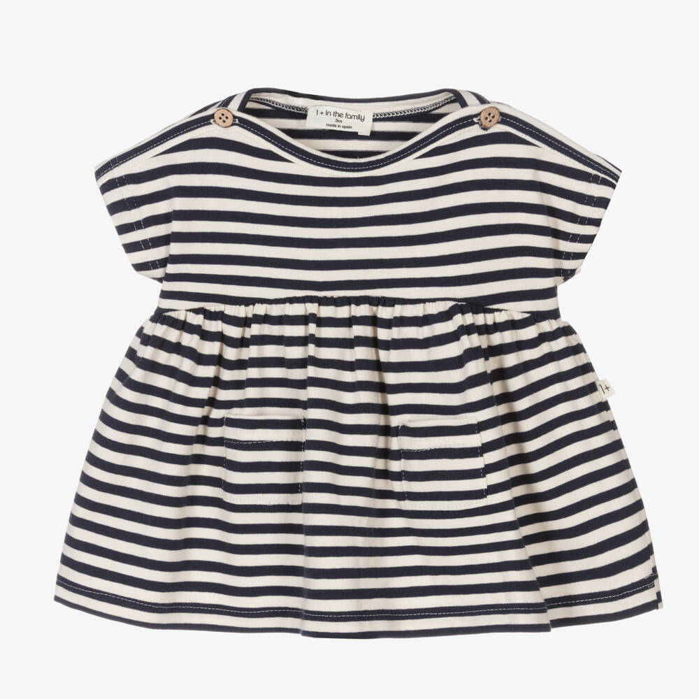 Casual navy blue and ivory striped dress for little girls from 1 + in the family, made in soft and stretchy cotton blend jersey. It has two small drop pockets on the front and wooden button fastenings on the shoulder for an alternative finish to a timeless piece.