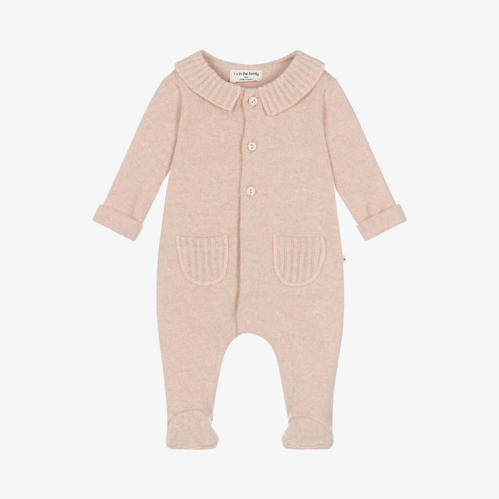Pale pink babygrow for girls by Spanish brand 1 + in the family, with a ribbed collar and coordinating patch pockets. Beautifully comfortable, it is knitted in a super soft, brushed cotton and viscose blend. It fastens with buttons and poppers on the front and between the legs. 40% of the cotton yarn used in this fabric is recycled.