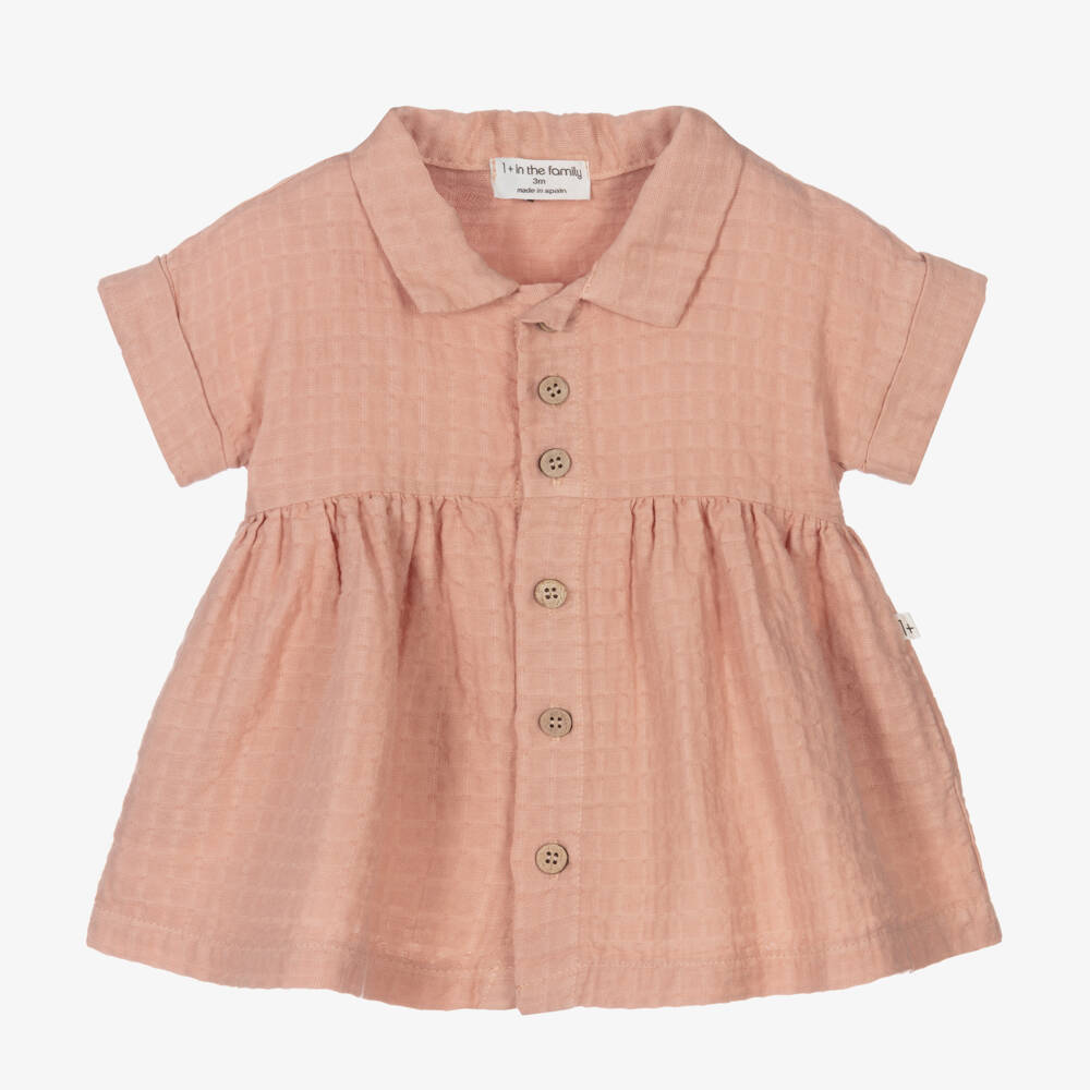 Dusky pink cotton seersucker dress for little girls from 1 + in the family. Soft and lightweight, it has an A-line cut allowing movement and comfort. The pointed collar, turned-up sleeves, and wooden buttons give it an adorable finish.