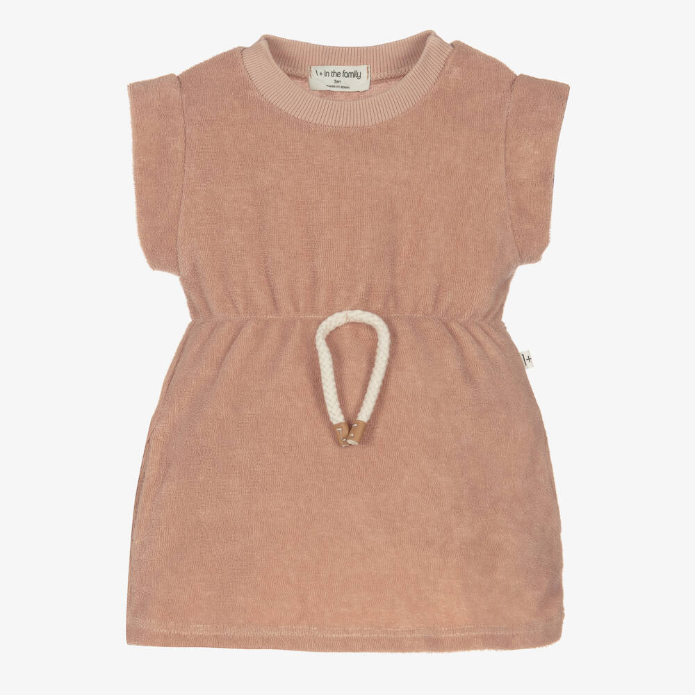 Dusky pink dress for little girls from 1 + in the family, made in cotton blend terry towelling. This A-line dress is cool and comfortable, with a decorative drawstring on the front and side seam pockets.