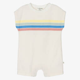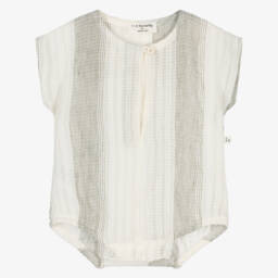 Green cotton shortie for baby boys and girls from 1 + in the family, made from soft, lightweight muslin offering breathability and comfort. This charming piece features a revere collar, wooden buttons, and short sleeves, making it ideal for warm weather. The style is complete with soft ribbed trims and popper fastenings between the legs for easy changing.