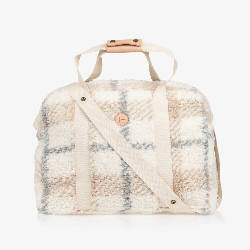 An ivory changing bag by 1 + in the family, made in soft sherpa fleece. Patterned in a charming beige and grey check design, this spacious bag is lined in soft canvas. There are three internal slip pockets and a useful zip-up pocket, ideal for organising baby's essentials. It fastens across the top with a zip and is detailed with a tan brown leather logo tab on the front. The carry handles are secured together with a popper fastening leather strap and the shoulder strap has poppers to adjust the length, allowing it to be carried on the pram or stroller.