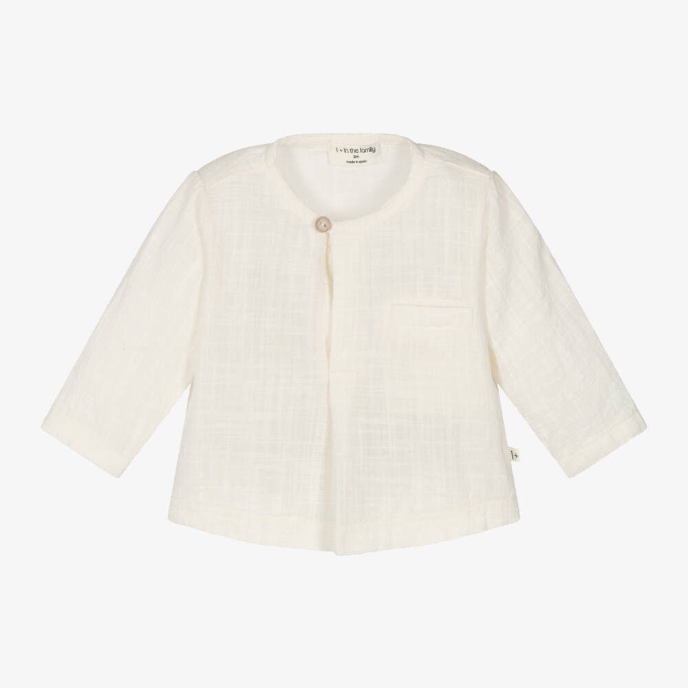Ivory muslin top for little boys and girls is by 1 + in the family. Comfortable for warm days, it is soft and lightweight, and has a simple button fastening on the neck. A subtle chest pocket completes the understated look.