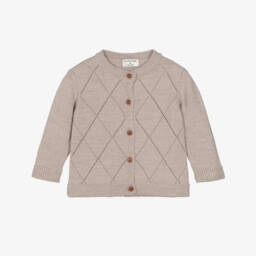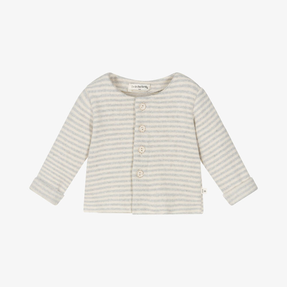 Super soft ivory and grey stripe cardigan for baby boys and girls by Spanish brand 1 + in the family. Knitted in a comfortable, brushed cotton and viscose blend, it has button fastenings on the front and cute, fixed turn-ups on the cuffs of the long sleeves. 40% of the cotton yarn used in this fabric is recycled.