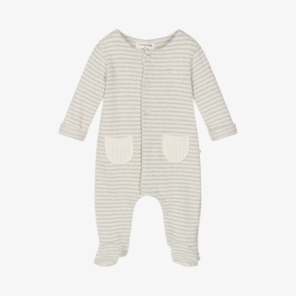 Cosy ivory and grey striped babygrow for boys and girls by Spanish brand 1 + in the family, knitted in a comfortable, brushed cotton and viscose blend. It has cute, fixed turn-ups on the sleeves, and ribbed, ivory patch pockets. It fastens with buttons and poppers on the front and between the legs. 40% of the cotton yarn used in this fabric is recycled.