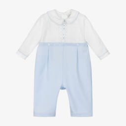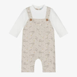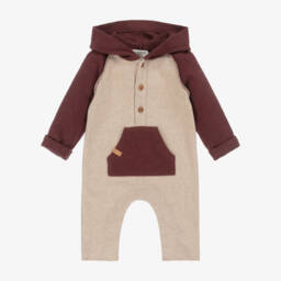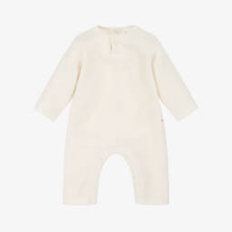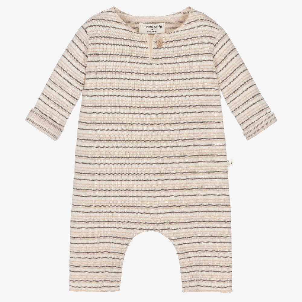 Ivory romper for baby boys and girls by 1 + in the family, knitted in a soft cotton blend. Patterned with beige and dark grey stripes, it has cute rolled up cuffs on the sleeves and overlocked edges on the neck and legs. It fastens with a wooden button on the front and useful poppers between the legs. 40% of the cotton yarn used in this fabric is recycled.