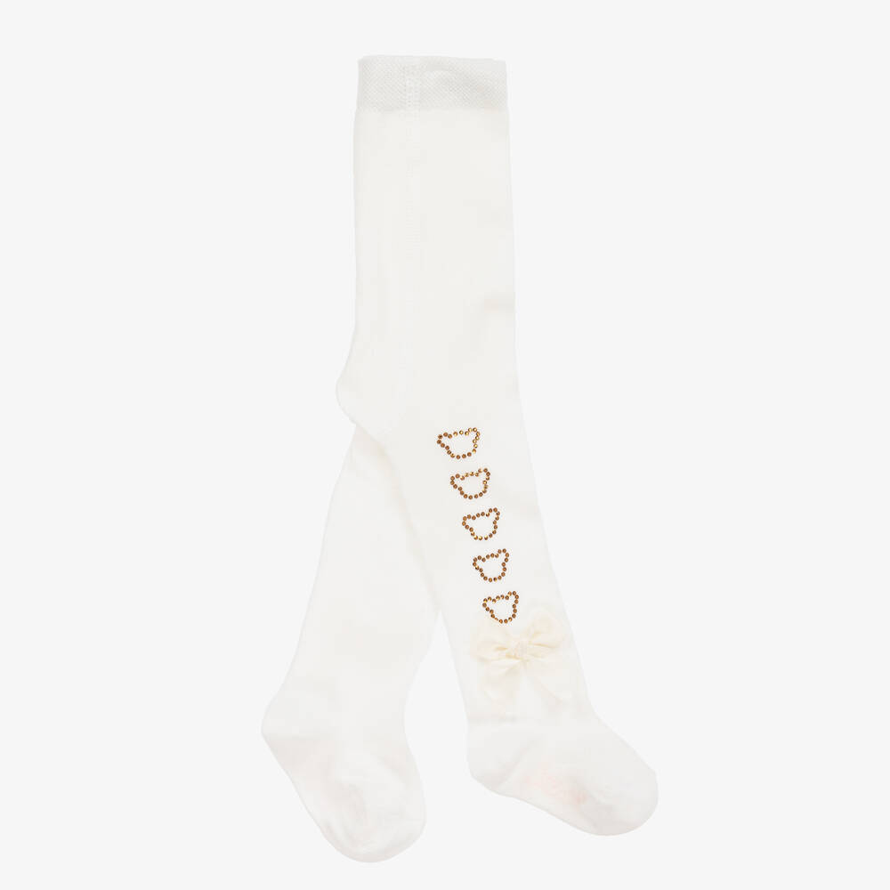 Delightful ivory tights for baby girls from Little A by A Dee, made from a soft knit. They have gold diamanté teddy bear motifs and silky ribbon appliqué bows for a sweet look. The elasticated waist ensures a comfortable fit and there are pale pink jacquard logos on the soles of the feet for subtle branding.