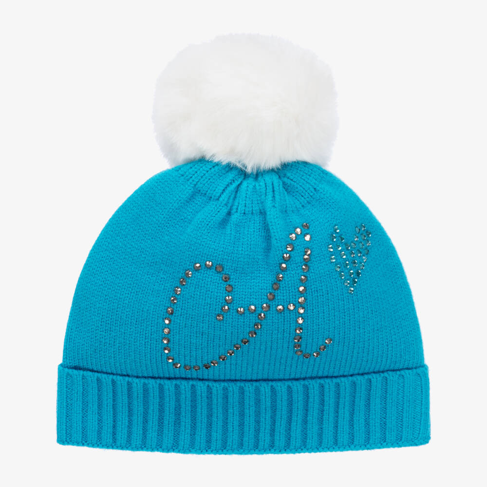 Vibrant turquoise blue hat for girls by A Dee, with a white faux fur pom-pom on the top. Softly knitted, with a ribbed turn-up brim, it has a logo motif on the front and a branded patch on the back, sparkling with diamantés for a glamorous touch. The fun pom-pom is detachable with a hidden popper fastening.