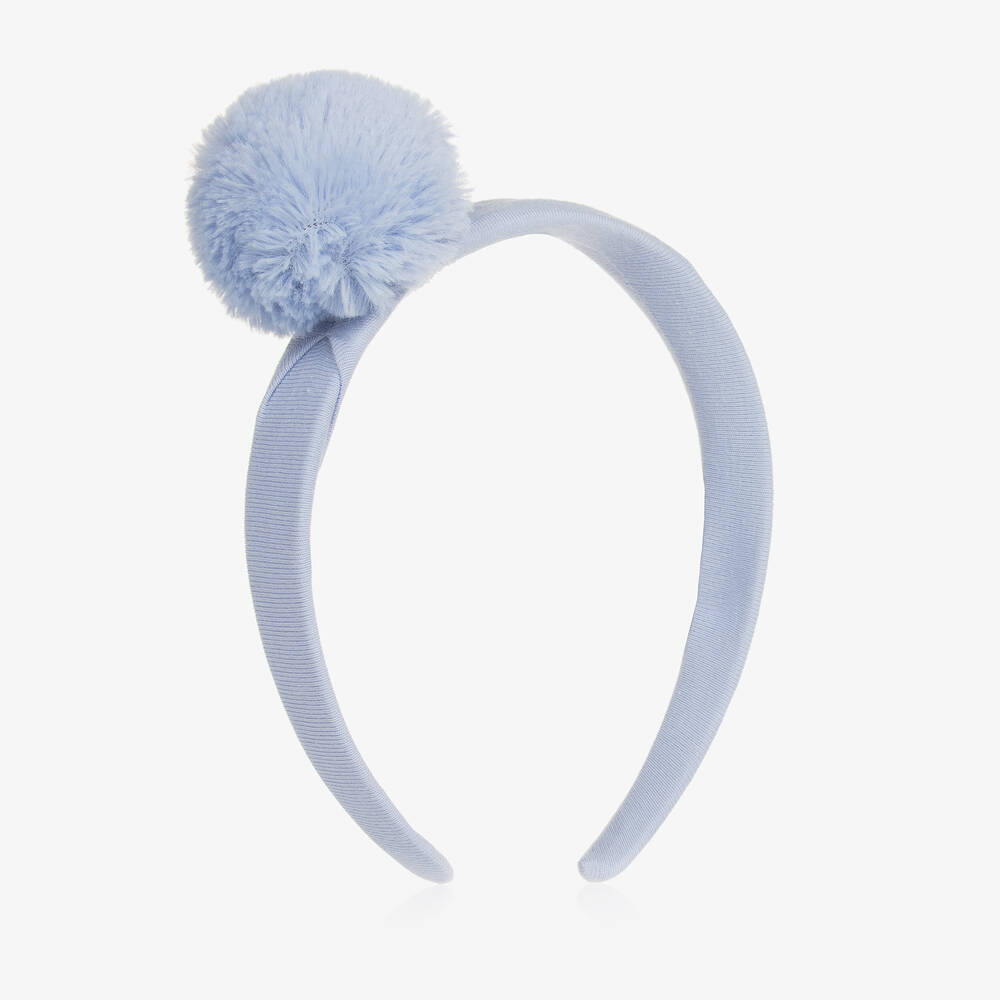 Cornflower blue hairband for girls by A Dee, completing any special look. The flexible band is covered in soft jersey fabric and topped with a faux fur pom-pom for a pretty touch.