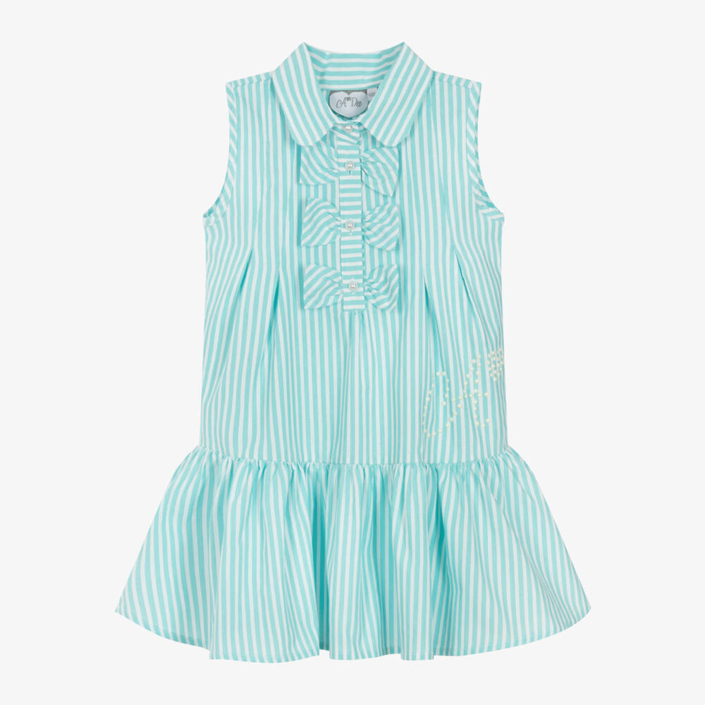 In a lovely shade of turquoise blue, a striped dress for girls by A Dee, woven in lightweight cotton. Ideal for warm summer days, this sleeveless design has a collared neckline and frilled hem. It fastens with faux pearl buttons on the front, detailed with pretty bows. For a stylish designer finish, a logo design can be seen on one side, created from faux pearl beads.