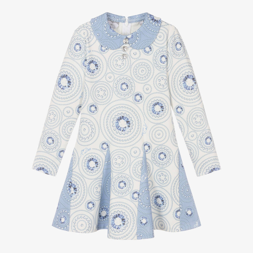 Pretty white dress for girls by British brand A Dee, with a blue ice crystal and logo pattern. It has a contrasting blue collar with large, sparkling crystals sewn below, and matching panels in the skirt, giving a lovely flared silhouette. Made in soft, comfortable jersey, it has a concealed zip fastening on the back.