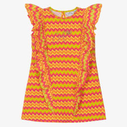 Pretty shimmery gold dress for little girls by A Dee, made in soft, mid-weight cotton jersey, with a warm and cosy fleecy inside. This cute dress has a rounded collar and a gold sequin and diamanté logo on the front. It has a dropped waist with a ruffle hem and a tulle and bow trim. There are additional layers of soft glittery tulle as a lining on the skirt to add extra volume. It fastens with poppers on the back.