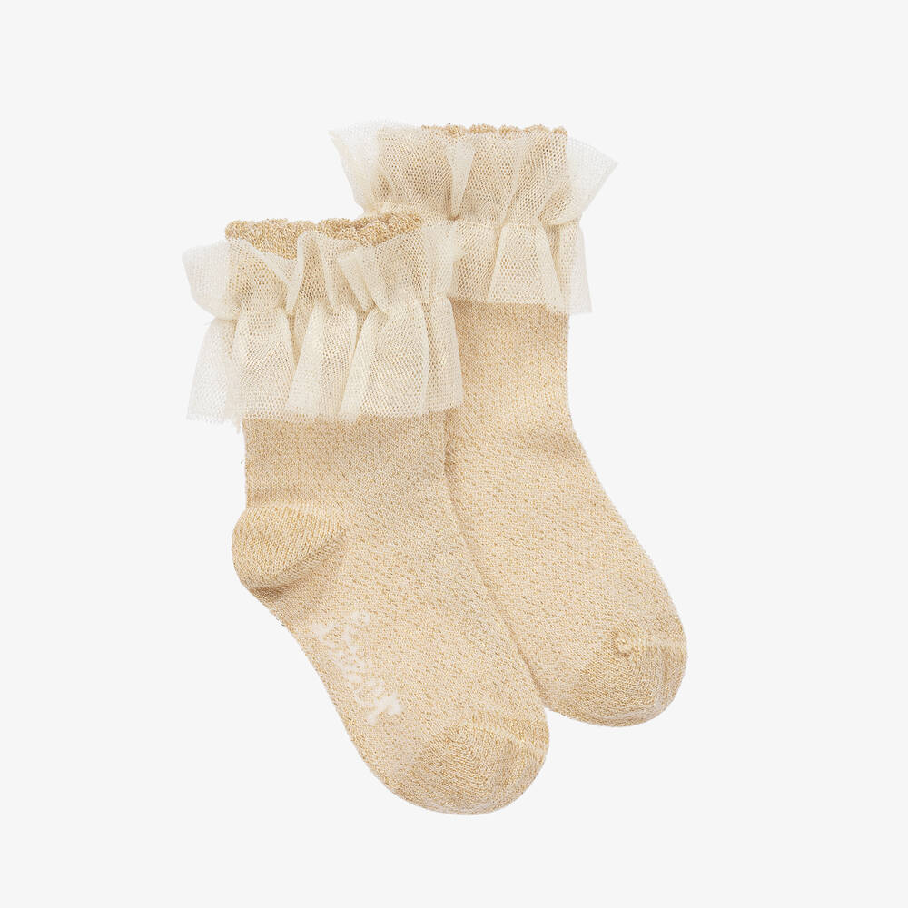 Glittery gold socks for little girls by Little A by A Dee, knitted in a stretchy cotton blend. These pretty socks have a frilly tulle trim around the ankle with scalloped edging.