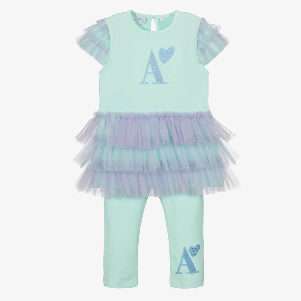 A green leggings set for girls by A Dee, made in soft and stretchy cotton jersey. Casual and comfortable, the tunic-style top has ruffle tulle trims on both the capped sleeves and hem in a lovely pastel purple shade. It fastens with a single button on the back and has a sparkling blue sequinned logo design on the front. The leggings have matching branding, along with a gently elasticated waistband.