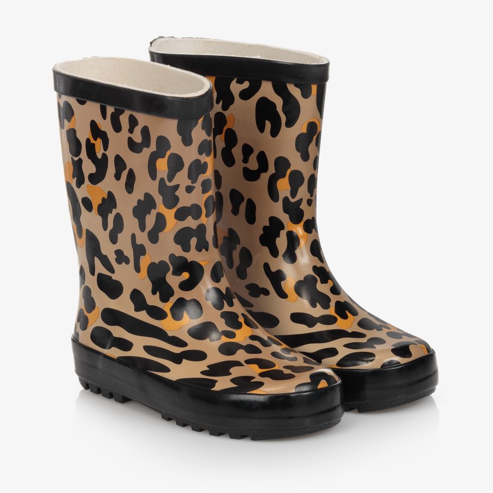 Girls rain boots by A Dee, with a beige leopard print. Waterproof, they have PVC uppers and moulded rubber soles for a good grip. These wellies have a soft cotton lining and slightly padded inner sole.