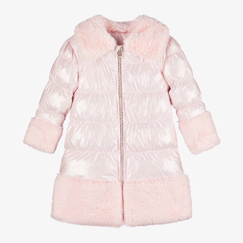 Girls Metallic Pink Faux Fur Trim Puffer Coat