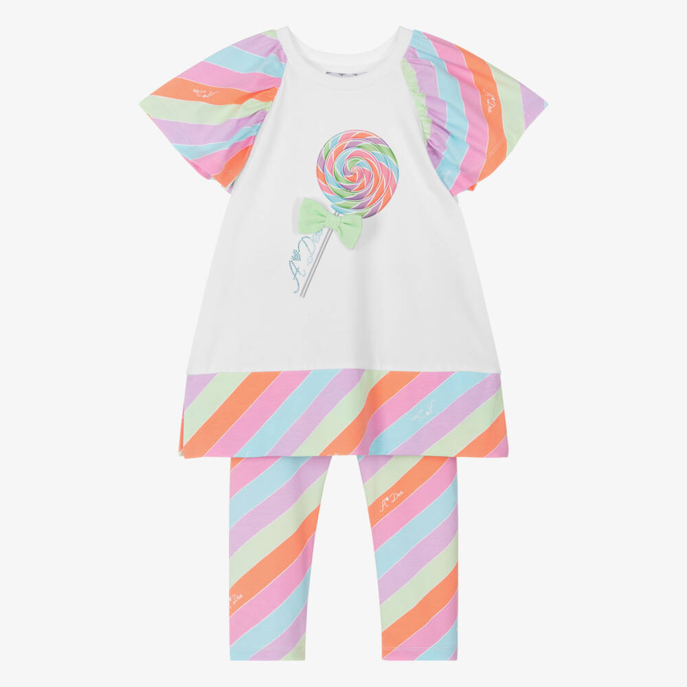 White with multicoloured stripes, this cotton leggings set for girls is by A Dee. The tunic-style top has wide flutter sleeves and a playful lollipop print on the front. Logo detailing shimmers in blue diamantés. The matching leggings are elasticated on the waist and complete this fun outfit set.