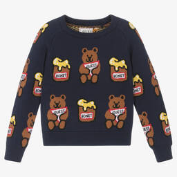 Navy blue chunky knit bobble hat for girls by A Dee, ideal for warmth and cosiness. It has a turned-up brim with a heart-shaped logo patch sparkling with diamantés. There is a large, detachable faux fur pom-pom on the top for a fun finish.