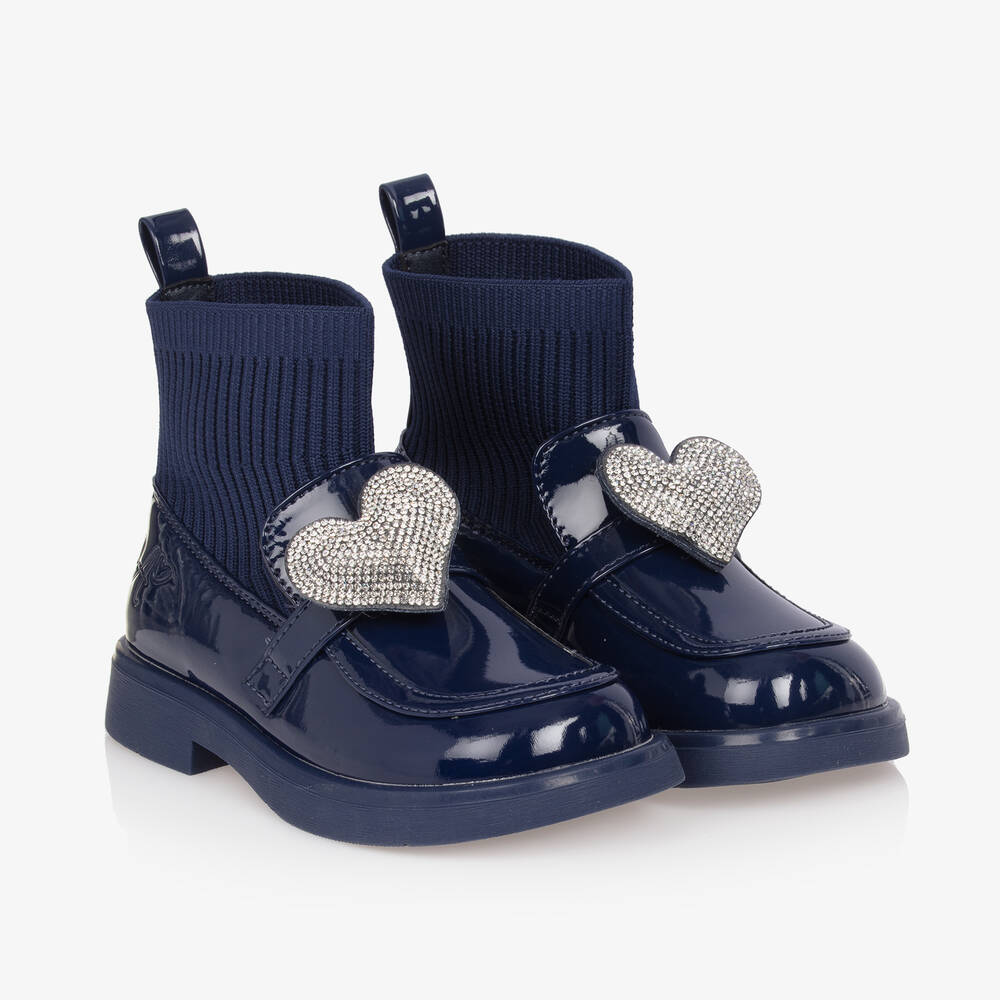 Navy blue slip-on ankle boots for girls by A Dee. Designed to look like a pair of loafers with socks, they are made from smooth patent faux leather with stretchy ribbed jersey attached sock-style cuffs. Decorated with beautiful diamanté hearts for a sparkly look, they are lined with soft velvet for extra comfort. An embossed logo features on the heel, and the tonal non-slip rubber outsoles provide good grip.