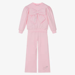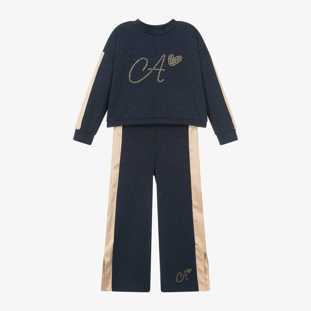 Adding a touch of sparkle to her casual wear, this navy blue trouser set for girls by A Dee has a lovely gold glitter finish. Both pieces are made in comfortable cotton jersey with a soft brushed feel inside and are trimmed with gold satin for a luxe sporty look. Designed to sit on the waist, the sweatshirt-style top has ribbed trims and a shaped, wrap-over back with a gorgeous gold bow appliqué. The straight-leg, jogger style trousers have a stretchy, elastic waistband and side split hems. Both pieces are complete with the British brand's logo in shiny gold diamantés.