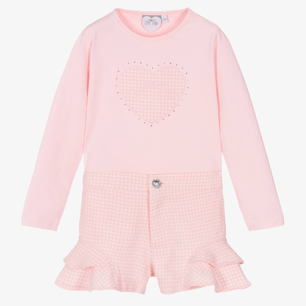 Delightful pale pink cotton shorts set for girls by A Dee. The houndstooth shorts have fluted tiered trims and a front zip and crystal button fastening for extra girliness. They also have an adjustable waist for a great fit. The crew neck top has a matching, branded heart on the chest, with diamanté embellishments.