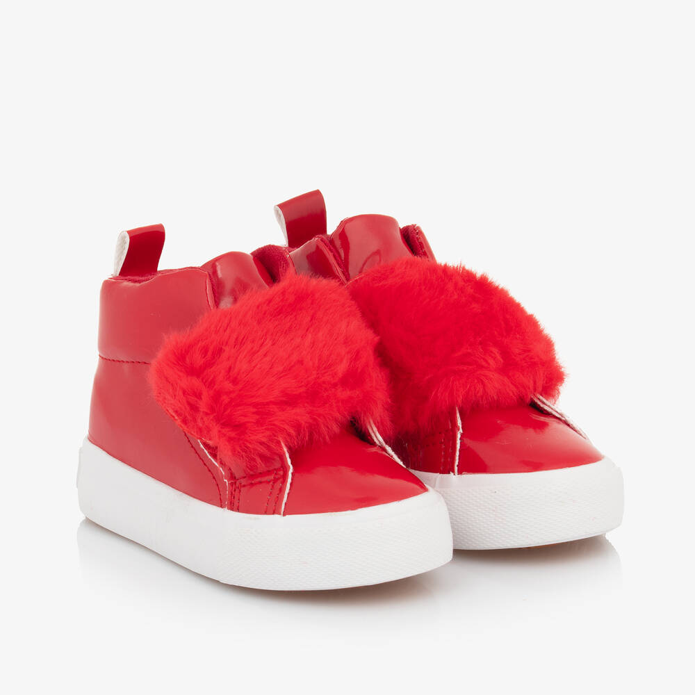 Gorgeous red high top trainers for little girls by A Dee, made in glossy, faux patent leather. They fasten with a fun, faux fur-trimmed velcro strap, and the designer's logo can be seen on the heel for a branded touch. Lined in comfortable fabric with a lightly cushioned insole, this cute and casual style is complete with a flexible non-slip rubber outer sole.