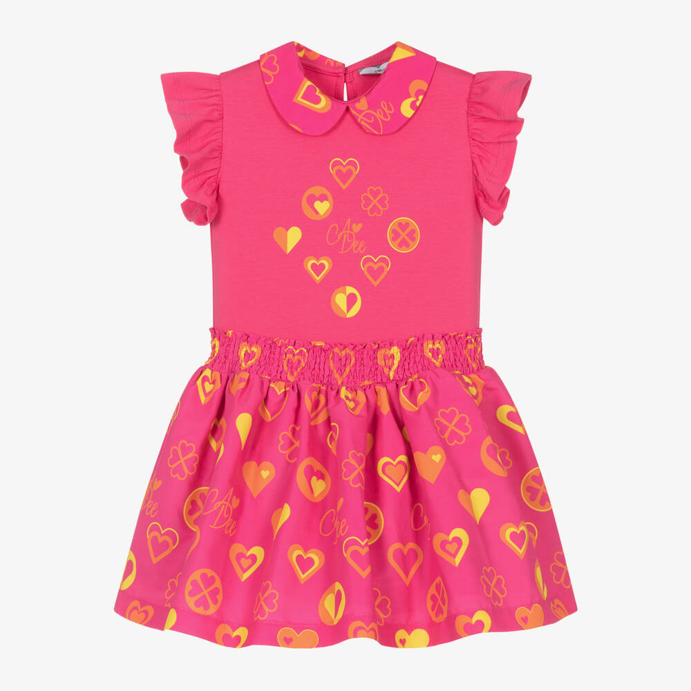 Lovely bright pink cotton dress for girls by British brand A Dee, patterned with logos and hearts in orange and yellow. With the look of a two piece, the soft, comfortable jersey bodice has ruffled sleeves and a poplin neckline. The gathered skirt has a ruched waistband and a tulle frill on the cotton lining for extra volume. There is a keyhole button fastening on the back.