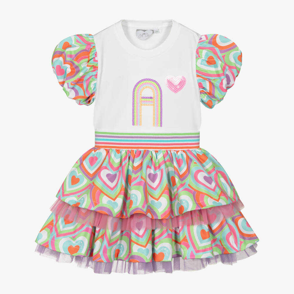 Cute and colourful, a pretty cotton skirt set for girls by A Dee, made in soft, comfortable jersey. The white T-shirt has a colourful, sequinned logo and heart on the front, with dramatic puffed sleeves patterned in colourful pink, green and purple hearts. The matching tiered skirt has tulle frills and a striped, elasticated waistband. Easy to wear, the set simply pulls on.