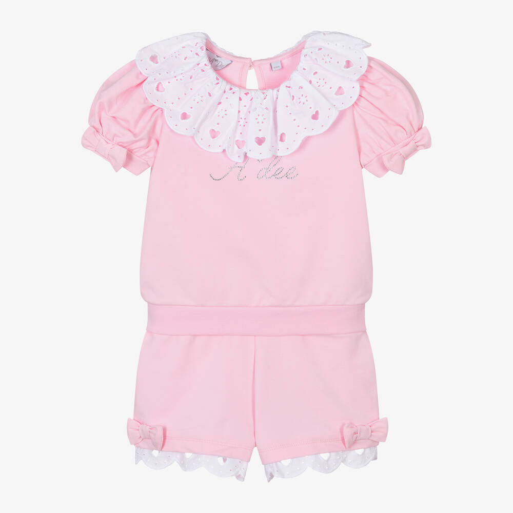 Sweet and pretty, this pink shorts set for girls by A Dee is made from soft mid-weight cotton jersey. Both pieces have lovely bow details and contrasting white broderie anglaise trims to enhance the feminine look. Decorated with a diamanté logo on the chest, the top has puffed short sleeves and a keyhole button fastening on the back. The coordinating shorts have an elasticated waist for a comfortable fit.