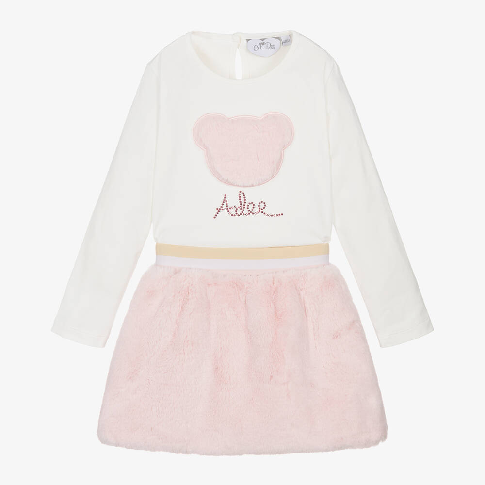 Stylish for girls, this ivory top and pale pink skirt set is by A Dee. Made in gorgeous plush faux fur, the skirt is lined in silky satin and has a comfortable elasticated waistband in beige and ivory. The long-sleeved cotton jersey top has a keyhole button fastening on the back, with a faux fur teddy appliqué and metallic studded logo on the front.