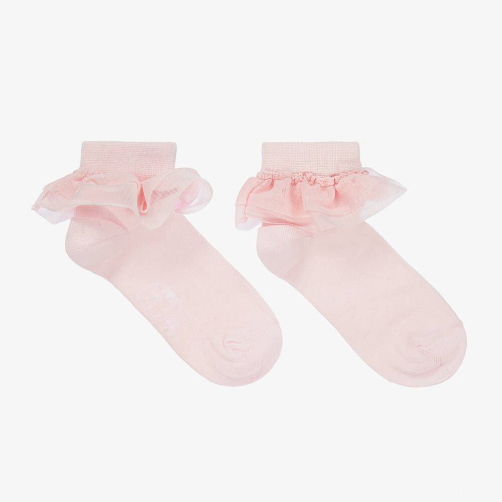 Pretty pink socks for girls, designed by A Dee. Ideal for adding a girly touch to any outfit, they have an organza frill around the ankle. Soft and stretchy, the brand's intarsia logo is sewn underneath each foot in white.