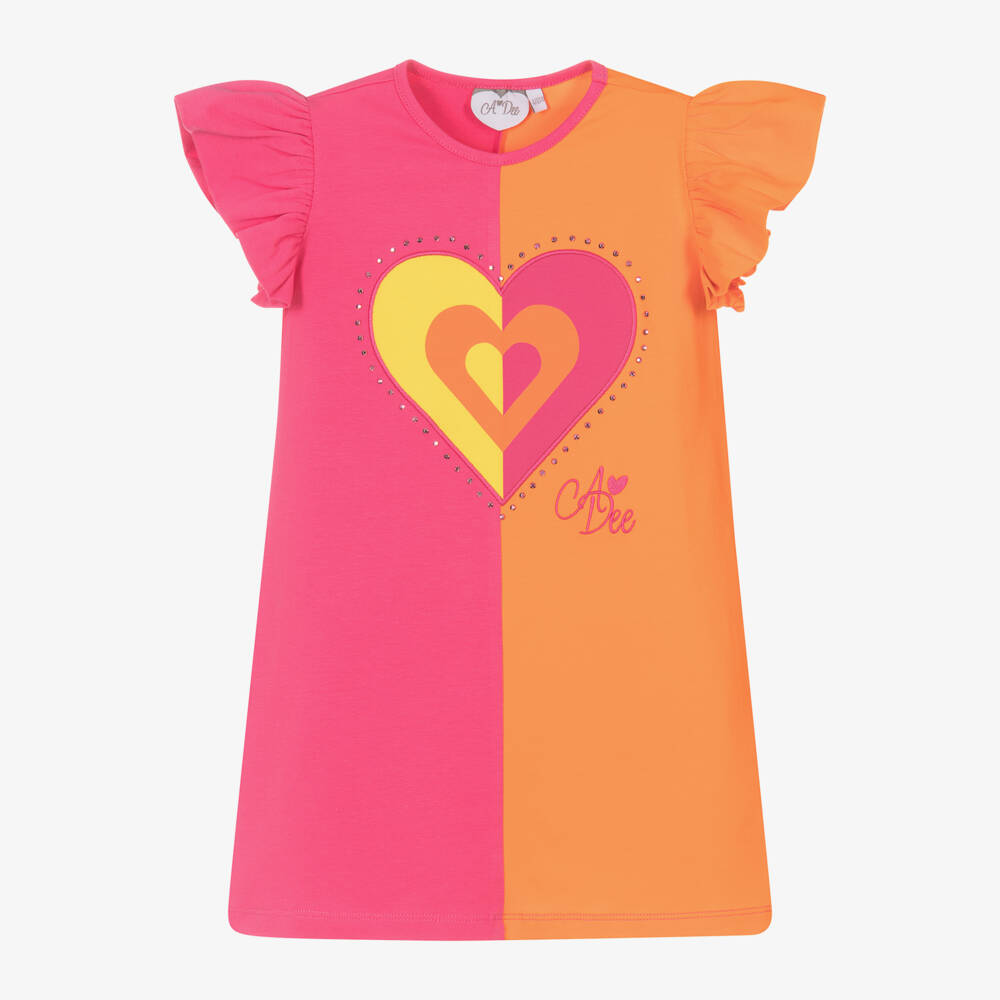 Fun, bright and eye-catching, a colour-blocked pink and orange dress for girls by British brand A Dee. Made in comfortable cotton jersey, it has a central, appliqué heart with yellow detailing, pink diamantés and an embroidered logo on one side. The dress has short, ruffled, angel sleeves and is easy to wear, simply pulling up.