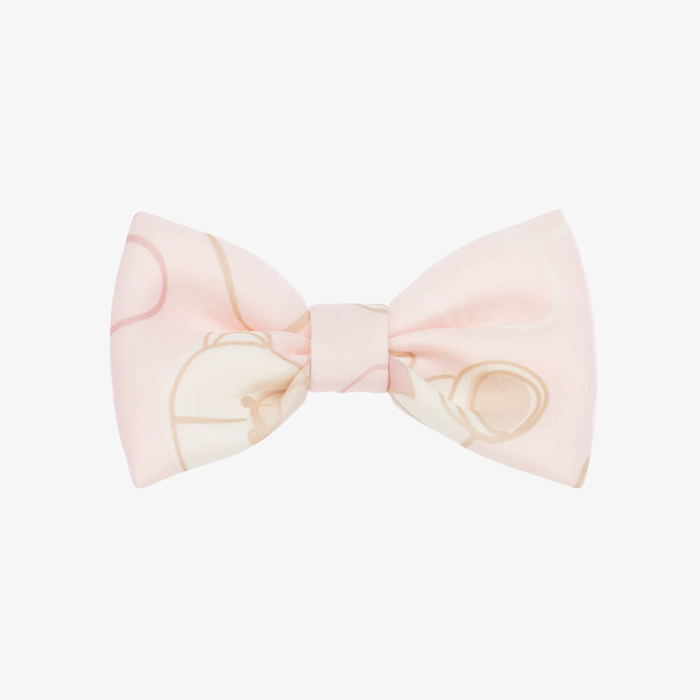 Sweet and pretty, this pale pink bow hair clip for girls is by A Dee. Patterned with an adorable branded teddy bear, heart and rose print, it is made from soft neoprene fabric. A charming accessory for any hairstyle, it has a silver metal crocodile clip that glides easily into the hair.