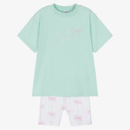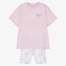 A pretty pink and white cotton jersey shorts set for girls by A Dee. Soft and comfortable, the T-shirt is adorned with a pearl bead logo and aqua blue bead bow. The coordinating cycling-style shorts have a charming pink bow and aqua blue heart pattern, with subtle pink logos and a stretchy elasticated waist.