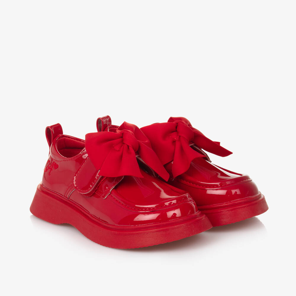 Stylish red loafers for girls by A Dee, made in shiny faux patent leather. They have a statement bow detail on the velcro fastening strap, with a signature embroidered logo at the side of the heel. They have a smooth faux leather lining and insole, with a chunky rubberised sole for good grip.