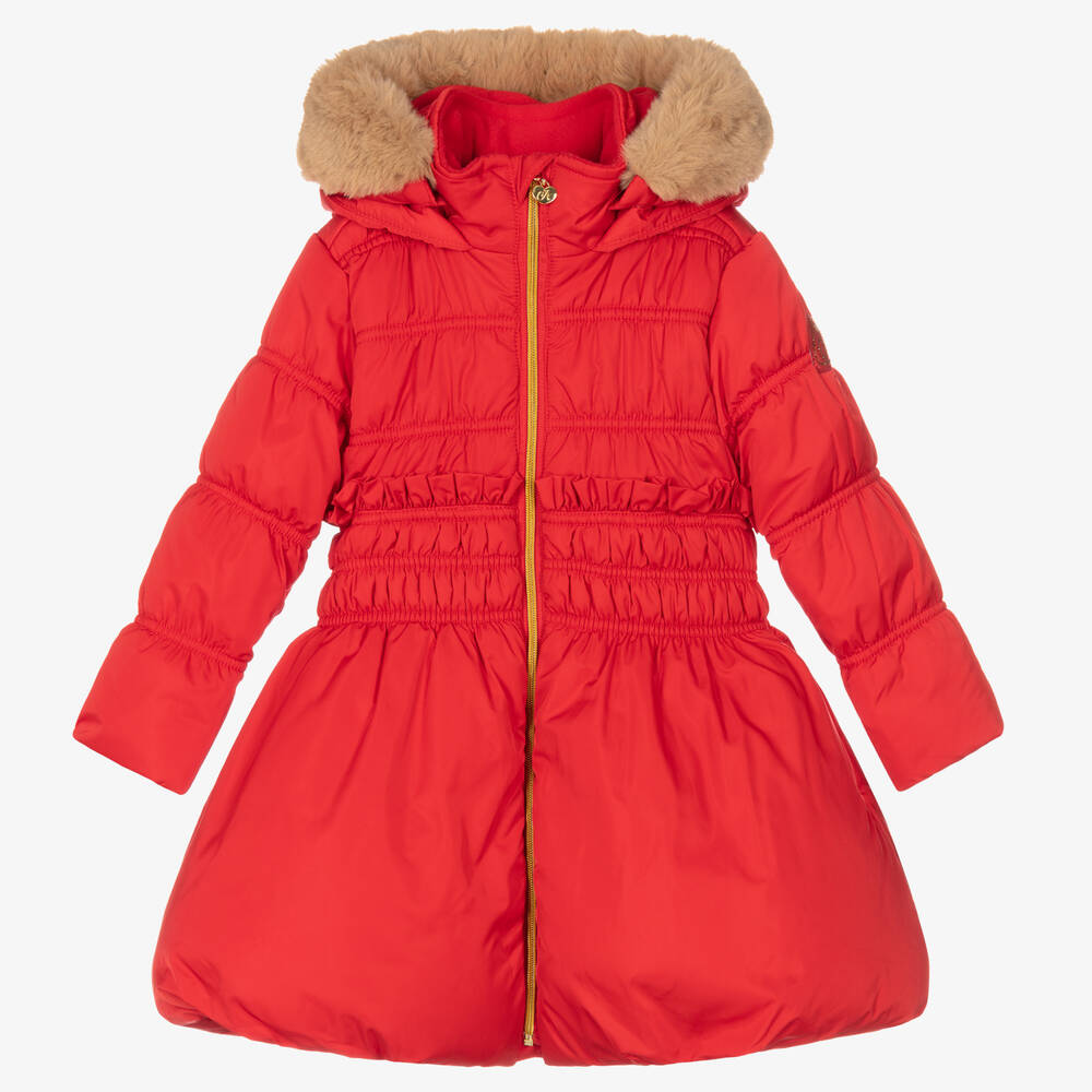 Pretty red puffer coat for girls by A Dee, made in a silky polyester. In a more modern style, it has a puffy A-line shape and ruffle trims around the waist, for a feminine look. Lightly padded and lined with polar fleece, it has a faux fur hood trim is full detachable, offering two different looks.