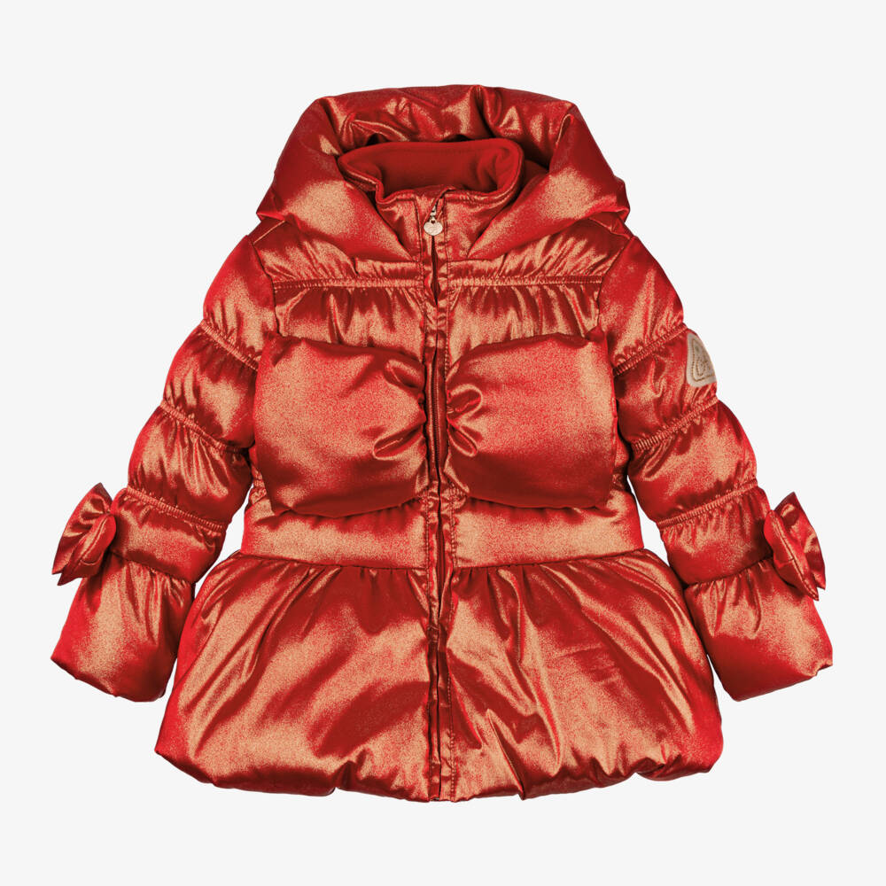 A gorgeous red hooded puffer coat for girls by A Dee, made in silky smooth fabric with a lovely gold shimmer. Padded for warmth, it has a cosy fleece lining and concealed, fleece-lined pockets. It flairs at the hem and has lovely padded bows on the front, back and cuffs. Completing the look with a designer touch, the zip fastens with a gold-tone branded pull, and there is a sparkly diamanté logo on one sleeve.