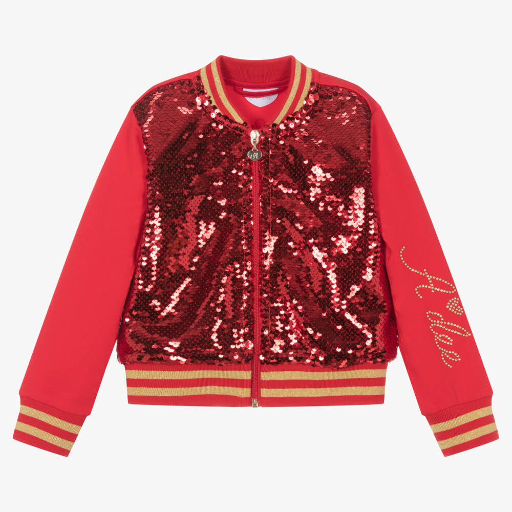 An eye-catching red zip-up top for girls by A Dee, in the style of a bomber jacket. Super sparkly, this top is covered with sequins on the front, has a diamanté crown on the back, and a matching logo on one sleeve. There are gold and red striped ribbed trims and a front zip fastening with a gold branded pull.