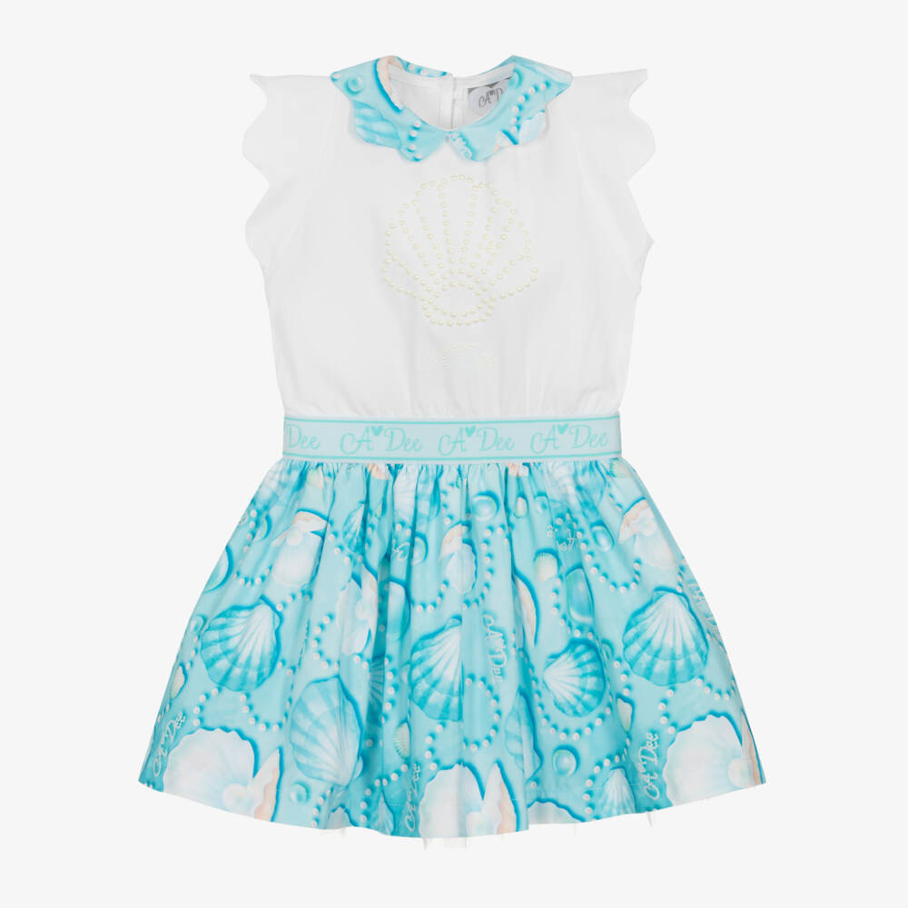 A white and turquoise blue dress for girls by A Dee. Made from soft cotton jersey, the bodice is decorated with a faux pearl shell design on the chest and has short sleeves with scalloped edges for a sweet finish. The smooth skirt is printed with a seashell and pearl print to match the charming collar. It has lightweight cotton-blended lining with a tulle panel for additional volume. There is a branded jacquard elasticated waistband and a keyhole button fastening on the back.