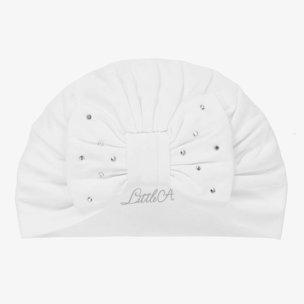 Pretty white turban for little girls by A Dee, made in stretchy cotton jersey. Embellished with sparkling silver diamantés, it has a sweet gathered bow on the front for a girly look.
