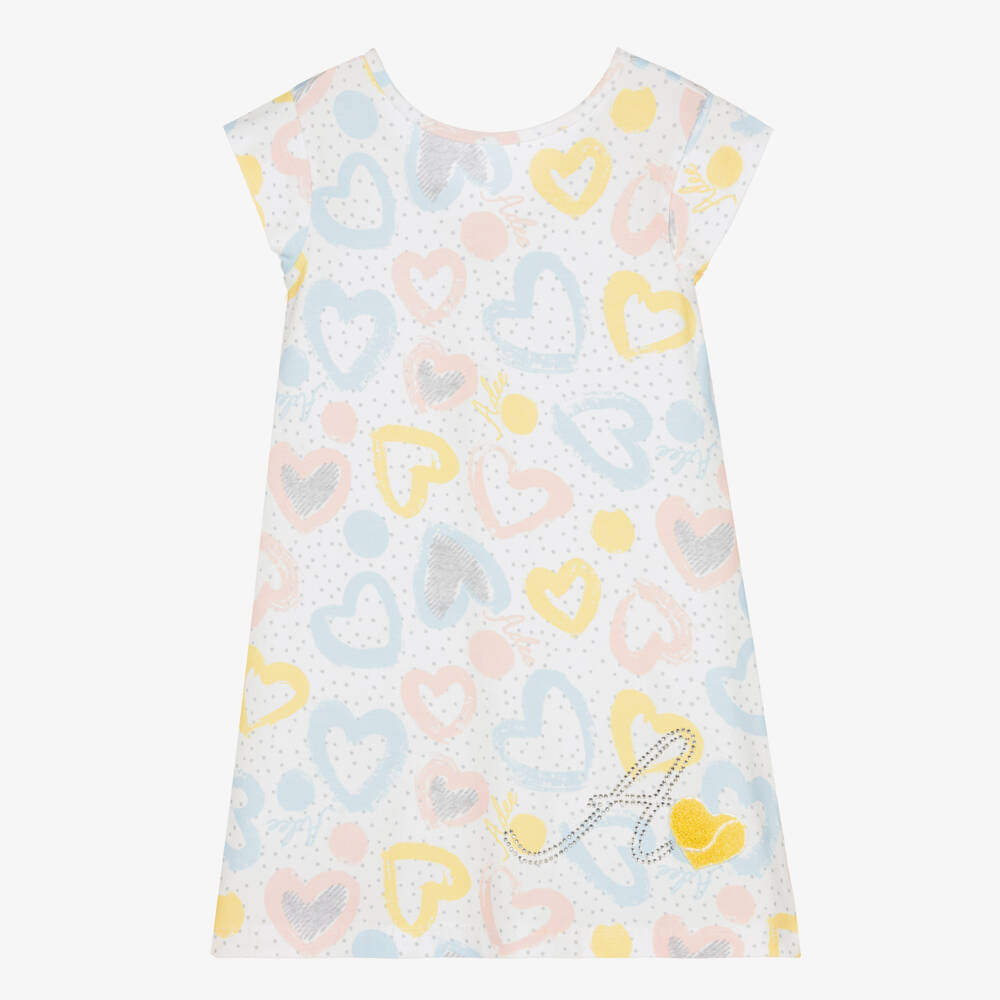 White dress for girls from A Dee, made in soft and stretchy cotton jersey. It has a sweet all-over pastel print of hearts and polka dots, with an eye-catching diamanté 'A' and yellow towelling patch on the front. The back is finished with three grosgrain ribbon bows.