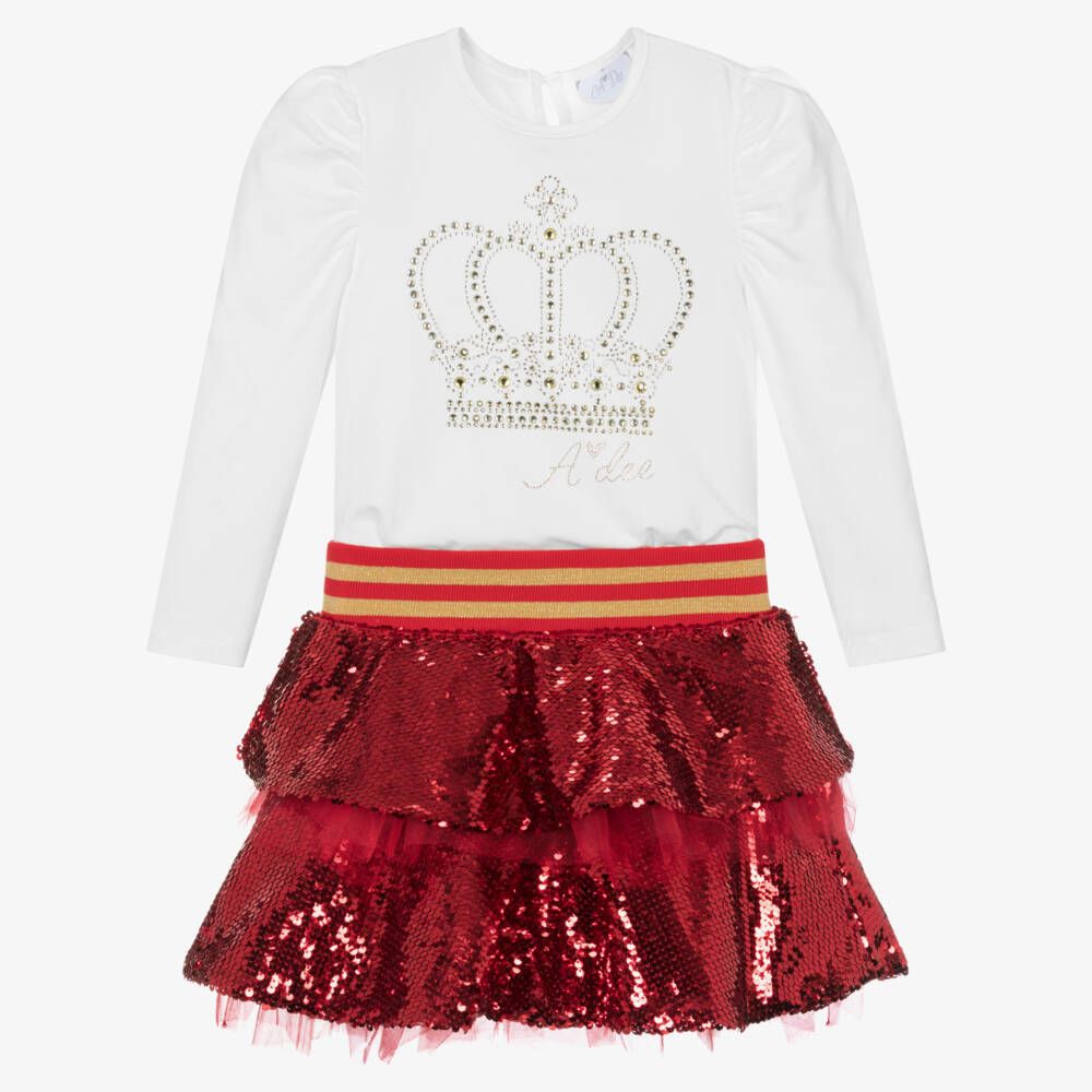 Stand out in this skirt set for girls by A Dee, including an off-white top and red sequined skirt. Made from soft cotton jersey, the top has long puffed sleeves, a branded diamanté crown design on the chest, and a keyhole button fastening on the back. Super sparkly, the tiered skirt is lined in silky satin and has layers of tulle for extra volume. There is a red and gold striped stretchy waistband to ensure a comfortable fit.