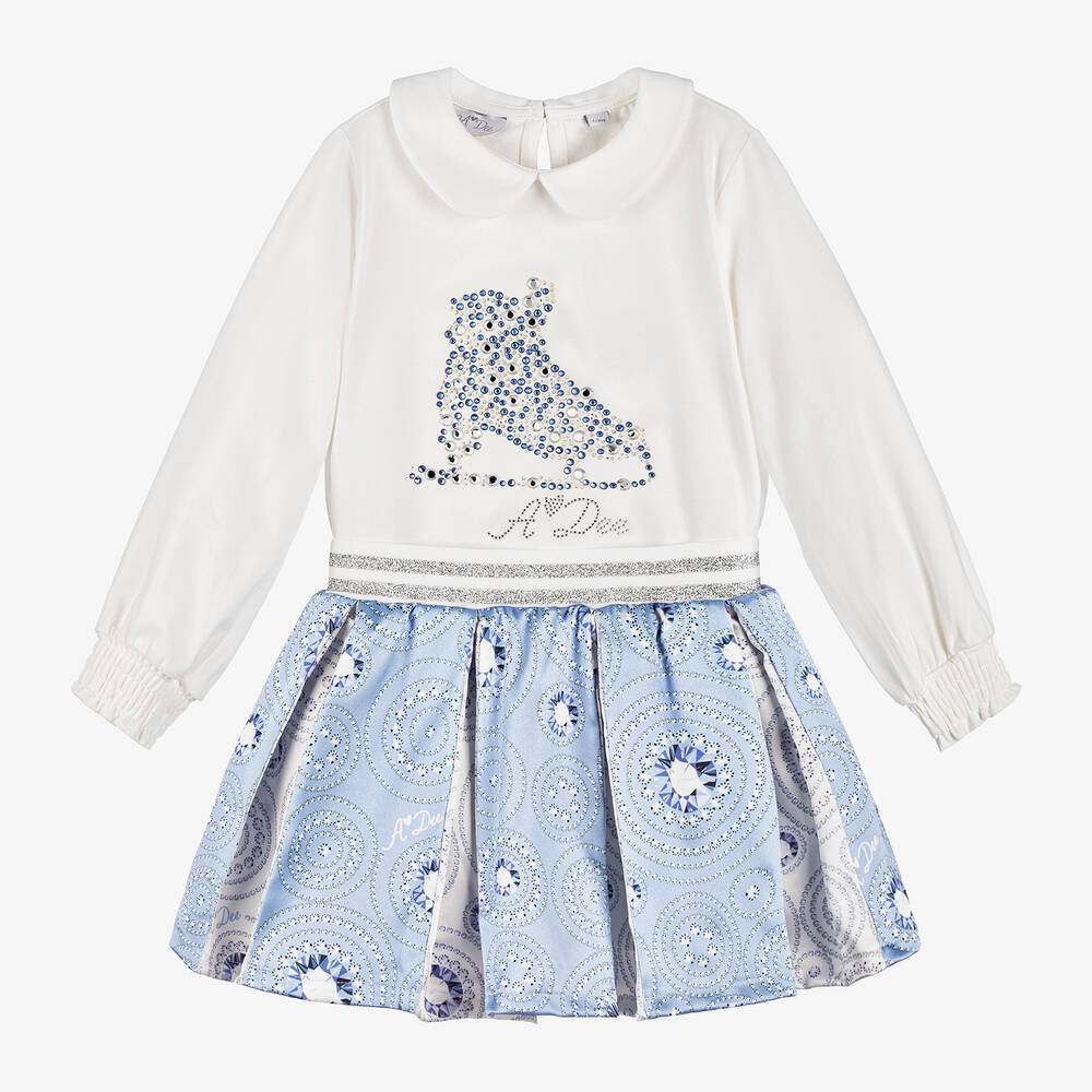 White and pale blue cotton skirt set for girls by British brand A Dee. Made in comfortable jersey, the long-sleeved top has a sparkling, diamanté ice skating boot and logo on the front. It has a Peter Pan collar, shirred cuffs and a keyhole button fastening on the back. The paired skirt has a pretty ice crystal and logo pattern and a stretchy tape waistband for added comfort. It has a full, pleated silhouette, lined with silky satin fabric.