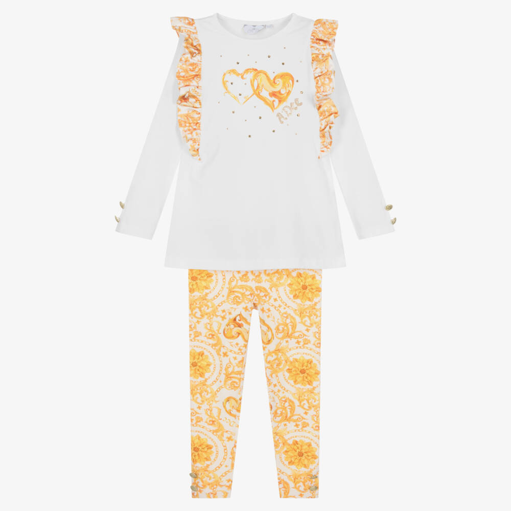 A fabulous white and gold leggings set for girls by A Dee, made from soft cotton jersey with embossed button detailing. The long-sleeved white top has a branded heart motif with gold stud details and gorgeous gold filigree trims. The eye-catching leggings are patterned with a matching design and have a gently elasticated waistband for a comfortable fit.