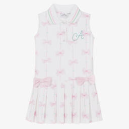 White and gold shorts set for girls by A Dee with a stylish golden filigree design. The white cotton jersey top has long ruched sleeves and a gold studded 'love' slogan across the chest. The fully lined shorts are soft and silky, with black sparkly logo trims and an elasticated waist for a comfortable fit.