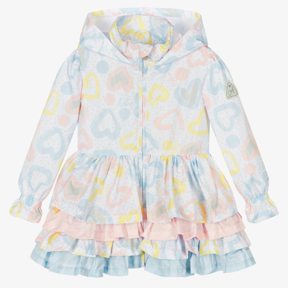 Pretty white coat for girls from A Dee. Silky smooth and lined with jersey for added comfort, it has a print of hearts and polka dots in pastel colours and a fun ruffled tiered hem. It is hooded, has elasticated wrists and a zip fastening to keep the warmth in.