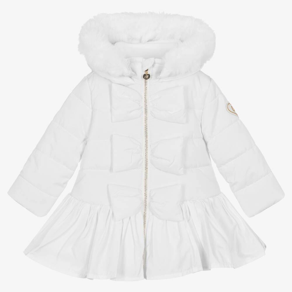 A bright white coat for little girls by A Dee, made from silky smooth fabric with a polar fleece lining for extra warmth. Combining comfort and girlish charm, this pretty coat has decorative bows on the front and a ruffled layer on the flared hem. Padded for colder temperatures, it has a gold zip fastening on the front with diamanté detailing and a chin guard to protect little necks. The detachable faux fur trim on the hood attaches with buttons and the heart-shaped logo design on the arm adds a sparkling finishing touch.